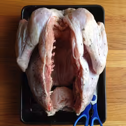 Turkey with backbone removed in preparation for spatchcocking