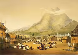 A marae at Kaitotehe, near Taupiri mountain, Waikato district, 1844. It was associated with Pōtatau Te Wherowhero, a chief who became the first Māori king.