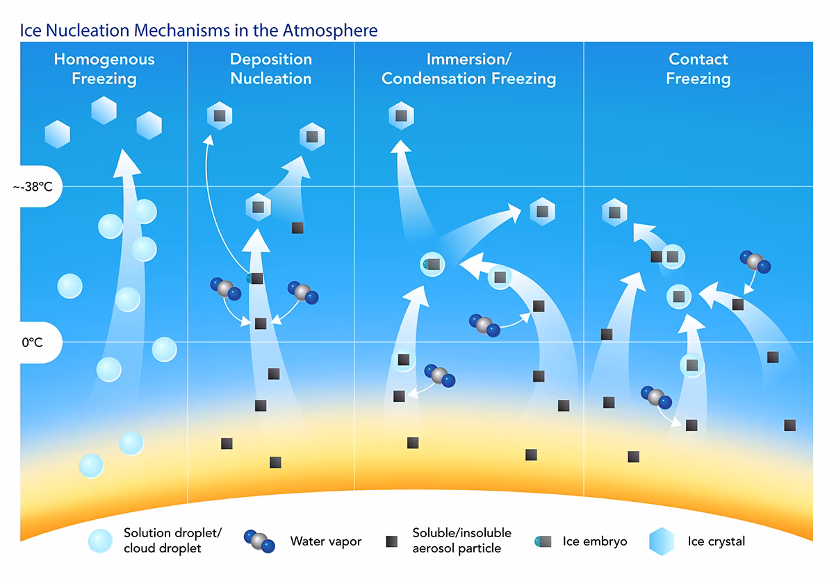 Ice nucleation mechanisms describe four modes that are responsible for the formation of primary ice crystals in the atmosphere.